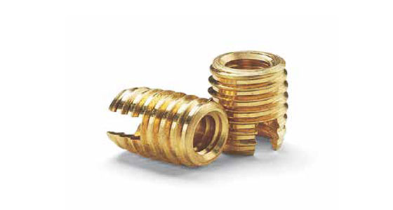 Available in standard or flanged configuration, Self-Threading inserts are brass inserts having both an external and internal thread and two slots which provide rapid cutting action. When driven into a cored or drilled hole, the insert cuts its own thread cleanly and evenly.
